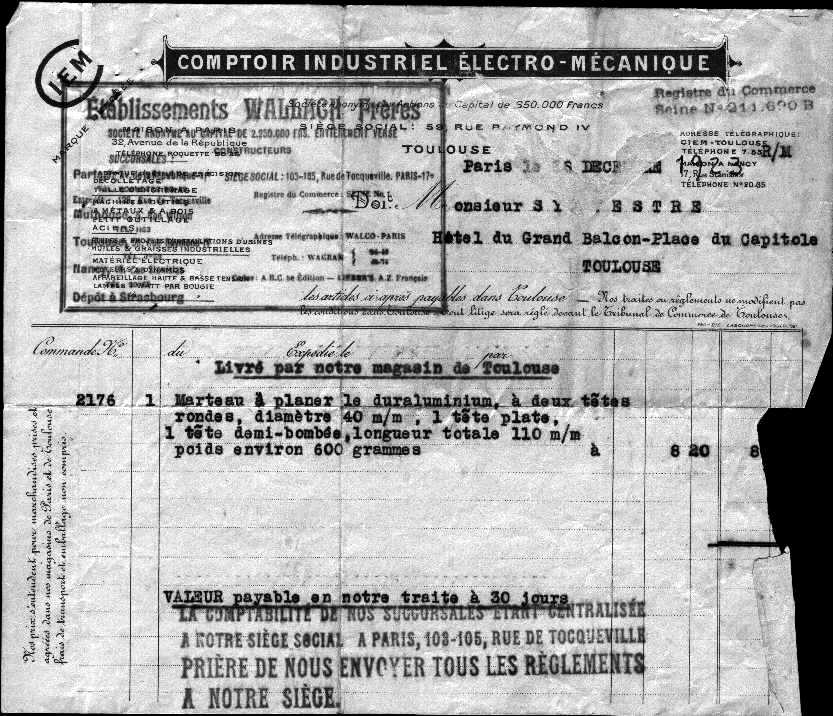 Document de la commande concernant "Le Marteau" servant à planer le Duralumin et dont il fut le concepteur.
